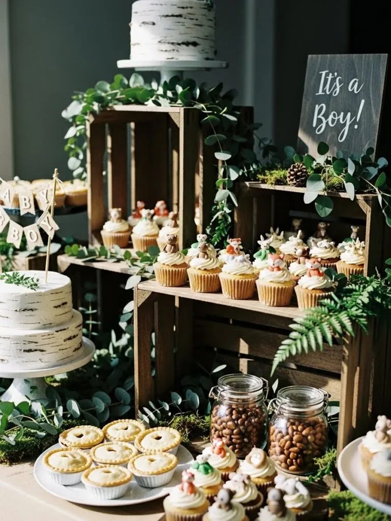 This setup feels like a sweet little forest bakery tucked into a cozy home corner. Wooden crates are stacked at different heights to create a layered dessert display filled with cupcakes topped with tiny woodland animals. Soft greenery spills around the shelves and table edges which adds that fresh outdoorsy feel without looking messy. Birch style cake stands and neutral toned treats keep everything calm and cohesive while the It’s a Boy sign adds just the right celebratory touch. The whole scene feels warm natural and thoughtfully styled with lots of charming details to notice up close.