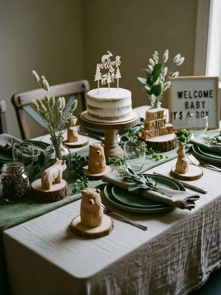 This sweet woodland table setting feels like a cozy forest moment brought right indoors. The natural linen tablecloth sets a soft neutral base while layers of sage green plates and fabric napkins keep everything calm and earthy. Little wooden animal figurines sit on round wood slice coasters like tiny forest guests, which honestly might be my favorite detail. Greenery runs down the center of the table with simple glass vases and sprigs of leaves that look freshly gathered. The rustic cake stand with a simple white cake and woodland topper ties it all together, while wooden blocks spelling out baby add that playful baby shower touch without feeling overdone.