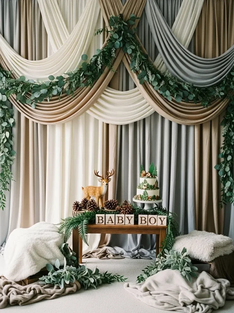 This setup features a beautifully layered woodland backdrop made with flowing fabric panels in soft neutrals like cream taupe and gentle gray. The draping creates a cozy tent like feel while eucalyptus garlands and greenery add that fresh forest touch. A simple wooden table grounds the look with rustic charm and is styled with pinecones greenery and sweet woodland details like a little deer figurine and a nature inspired cake. Plush floor cushions and soft throws complete the scene and make the whole space feel inviting and relaxed rather than overly styled.