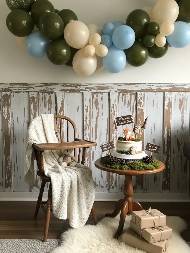 This setup feels like a sweet little woodland nook pulled straight out of a storybook. The rustic wood chair paired with a soft knit blanket instantly adds warmth, while the weathered wood backdrop brings in that perfectly imperfect farmhouse feel. I love how the balloon garland mixes muted greens, creamy neutrals, and soft blue tones because it keeps everything playful without feeling loud. The small round table with the woodland themed cake steals the show, especially with those adorable animal toppers and mossy accents that really lean into the forest vibe. Even the wrapped gifts and fluffy rug feel thoughtfully placed, like they belong right there.