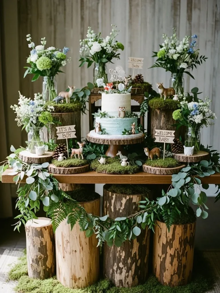 This woodland baby shower setup feels like a little forest clearing brought indoors. The layered wood stump pedestals create height and texture while keeping everything grounded and rustic. Soft greenery drapes across the table with eucalyptus and moss adding that fresh woodland vibe. Delicate floral arrangements in glass jars keep things light and airy, and the adorable forest animal figurines tucked around the cake add just the right touch of whimsy. The pastel cake with leafy details ties the whole look together without feeling too themed or overdone.