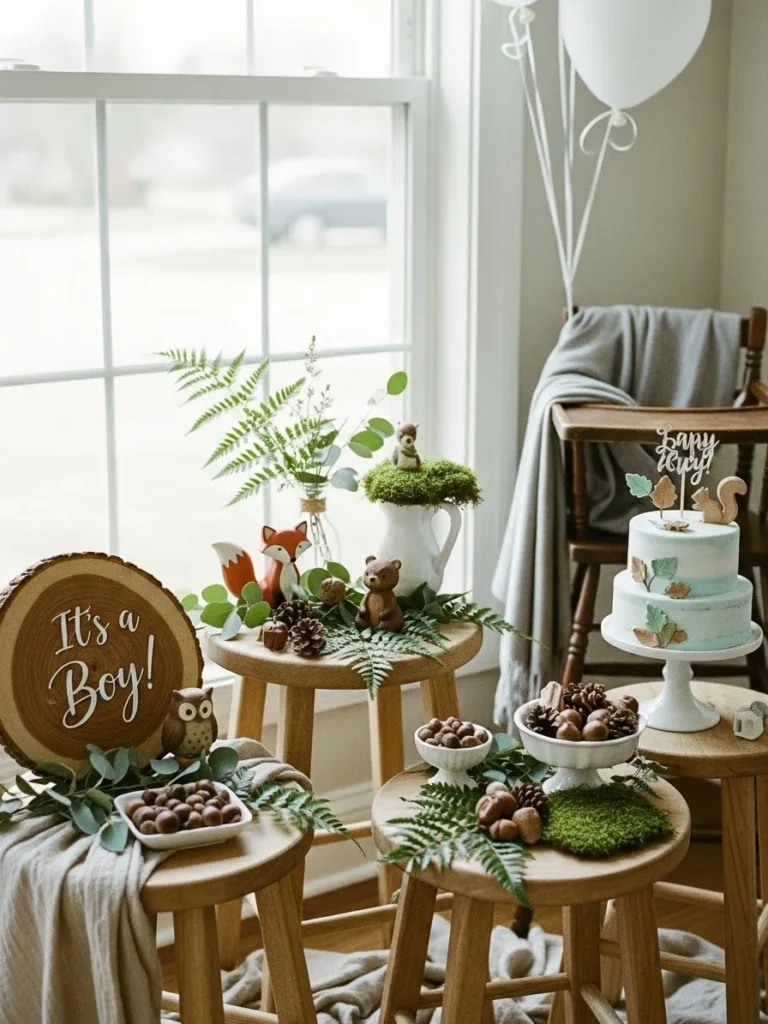 This woodland baby shower setup turns a simple fireplace mantel into the sweetest little forest moment. The rustic wood shelf is layered with lush greenery garlands, soft eucalyptus leaves, pinecones, and fluffy white florals that feel straight out of the woods. Cute details like wooden baby blocks, tiny directional signs, and a sleepy fox figure add charm without feeling overdone. The stone backdrop gives it that cozy cabin vibe, while the neutral greens and soft blues keep everything calm and boy friendly. Even the banner below ties it all together with that handmade, natural feel that works so beautifully for an indoor woodland theme.
