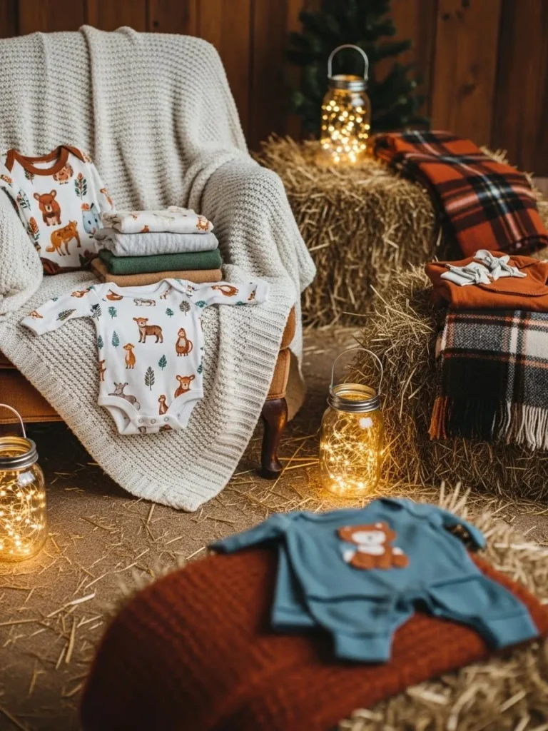 This setup feels like a little woodland corner brought indoors with soft knits layered over a warm chair, stacks of adorable baby onesies featuring forest animals, and natural elements like hay bales and wood tones grounding the whole scene. The earthy color palette mixes creamy whites, soft greens, warm browns, and hints of burnt orange, which instantly gives that cozy cabin vibe. Glass jars filled with twinkling lights add a gentle glow, while folded blankets and baby clothes double as both decor and gifts, making the whole display feel thoughtful and functional.