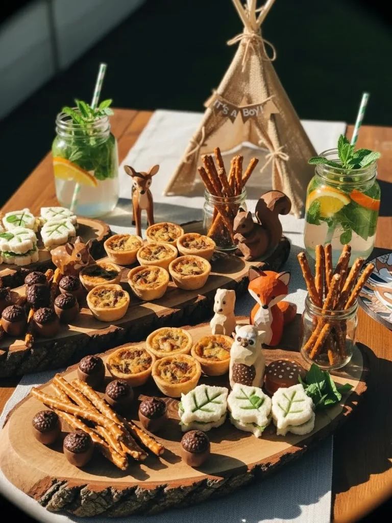 This setup feels like a little forest party brought indoors, with natural wood boards, soft neutral linens, and the sweetest woodland animal details scattered throughout. The layered wooden trays give the table a warm grounded look, while the tiny teepee backdrop and carved animal figures add that storybook charm that feels perfect for a baby boy shower. I love how the snacks are styled to feel playful but still polished, with leaf shaped treats, mini tarts, and simple glass jars filled with pretzel sticks and fresh citrus drinks. Everything looks thoughtfully placed without feeling fussy, which is exactly the balance rustic decor does best.