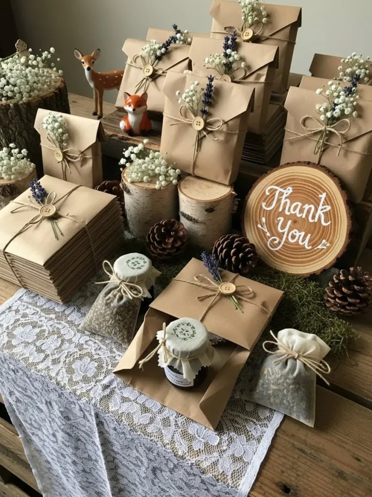 This woodland baby shower favor setup is all about cozy rustic charm with the sweetest handmade feel. Kraft paper favor bags are neatly stacked and tied with twine then finished with tiny dried florals for that soft forest touch. Wooden log risers add height and texture while little woodland animals like a fox and deer bring in a playful storybook vibe. Pinecones moss accents and lace fabric tie everything together so it feels warm natural and thoughtfully styled without looking overdone.