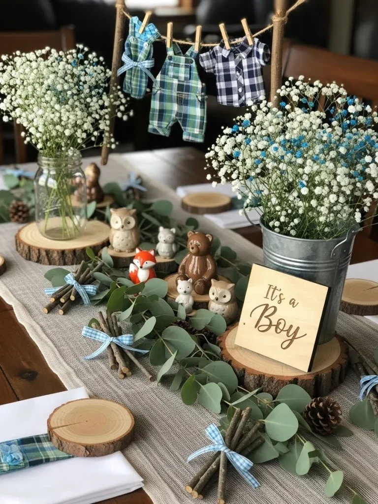 This woodland baby shower table setup feels warm and thoughtful without trying too hard. Natural wood slices create soft layers down the table while leafy greenery adds that fresh forest feel everyone loves. Sweet little woodland animals like the owl deer and fox are scattered along the center like they wandered in for the celebration. Tall candles bring a cozy glow and the blue check napkins paired with the simple Its a Boy sign keep everything playful and classic. The tiny knit baby booties resting on moss are such a heart melting detail that instantly sets the tone for a baby boy celebration.