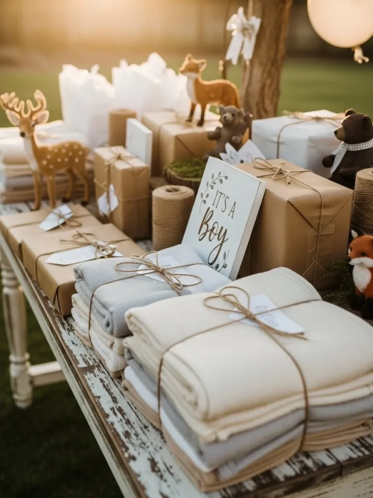 This sweet setup features a rustic wooden table styled with neutral wrapped gifts, soft folded blankets, and charming woodland details like little deer and teddy accents. Everything feels calm and cozy with kraft paper, twine ties, creamy fabrics, and soft muted tones that instantly give off that warm forest vibe. The mix of textures from wood, fabric, and paper keeps it visually interesting while still feeling simple and intentional. It looks like the kind of gift table you would stumble upon at a magical outdoor gathering under the trees.