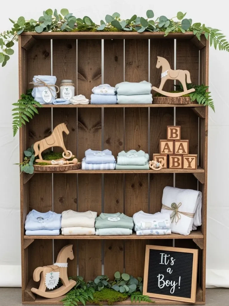 This charming wooden shelf setup feels like it was lifted straight from a cozy forest nursery. The warm wood tones create a grounded rustic base while neatly folded baby clothes in soft sage blue and creamy neutrals keep everything looking calm and curated. Wooden rocking horses add that sweet vintage touch and feel perfectly at home among the eucalyptus greenery tucked along the shelves. Little details like the wooden baby blocks and the It’s a Boy sign pull the whole look together and make it feel thoughtful without being overdone. Everything feels balanced and intentional but still relaxed and welcoming.