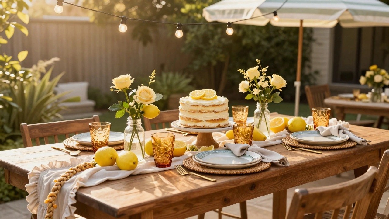 Set this up on a wooden patio table for an adult birthday or garden gathering. Pile lemons in low bowls or let them roll loose on a linen runner, then add amber glasses and plain plates. It works best in sunlight. Skip too many flowers or it gets busy.