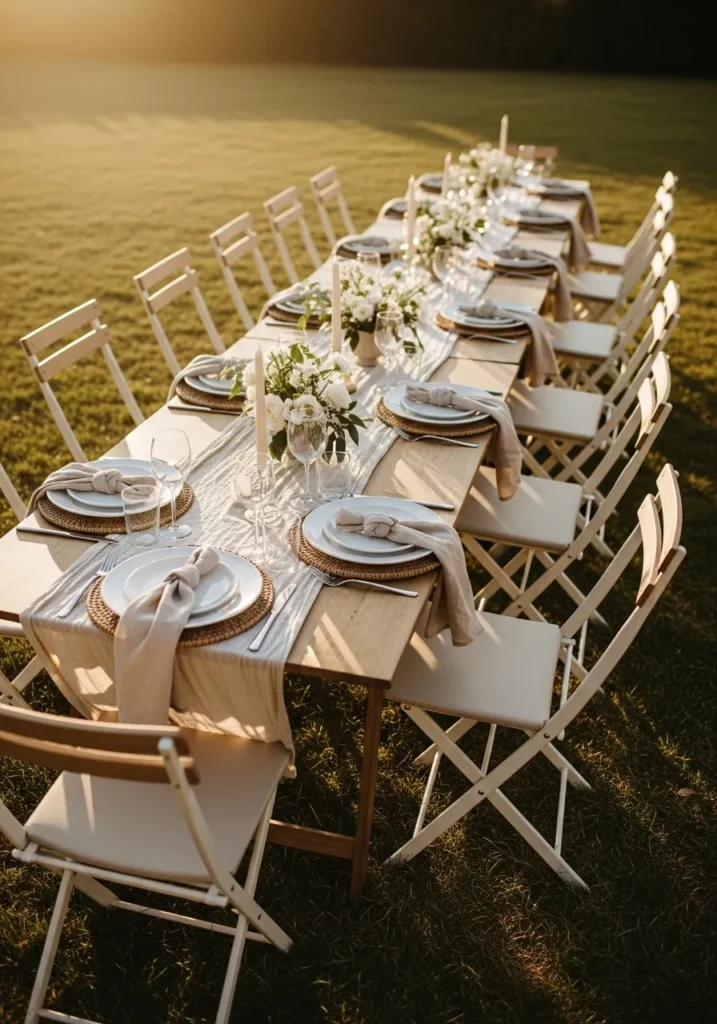 This long table is placed right on the grass with white chairs, soft linens, and simple place settings that feel clean and classic. The layout is straight and balanced, which keeps the whole setup calm and inviting. The open lawn gives it room to breathe.