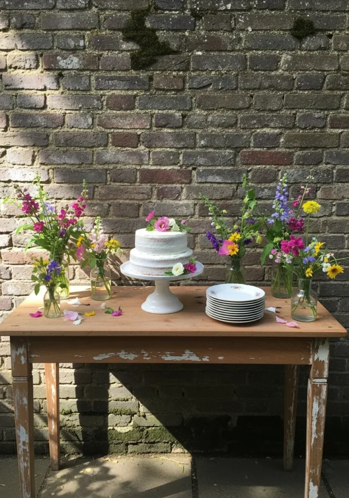 This dessert table is set against a textured brick wall with a simple cake, flowers, and a few serving pieces. The contrast between the rustic backdrop and the delicate details makes the setup feel charming and intentional.
