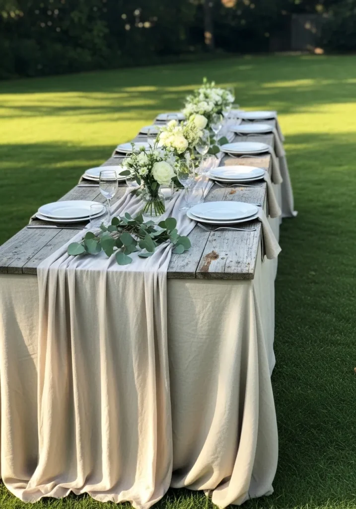 This long table is finished with a soft fabric runner, simple plates, and greenery arranged neatly down the center. The drape adds movement and softness without feeling fancy.