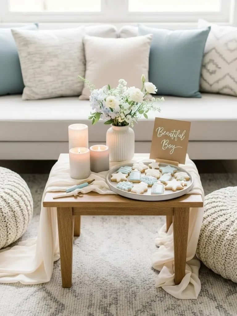This setup feels calm and cozy in the best possible way. A simple wooden coffee table is styled with a soft fabric runner that drapes gently onto the floor, instantly making the space feel relaxed and welcoming. The neutral palette leans into creamy whites, warm wood tones, and hints of soft blue that show up in the pillows and cookies. A small floral arrangement adds freshness without feeling fussy, while candles create that warm glow everyone loves during a daytime gathering. The low poufs on either side make it feel intimate and lived in, like guests are encouraged to sit down, snack, and stay awhile.