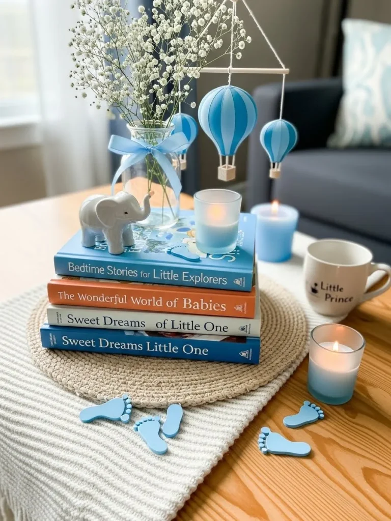 This sweet little setup feels like something straight out of a cozy bedtime story. Soft blue tones lead the way through stacked baby books that double as decor, topped with a tiny elephant figurine and a simple glass jar filled with delicate white florals tied up with a pale blue ribbon. The hot air balloon mobile adds a whimsical touch without feeling over the top, while the soft candlelight and woven textures keep everything calm and inviting. Small details like blue footprint accents and a simple mug tucked to the side make the whole space feel intentional yet relaxed, like it naturally came together on its own.