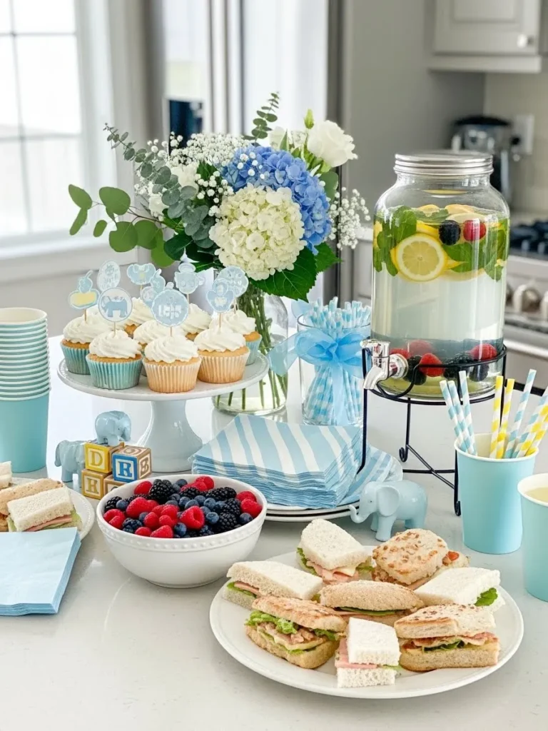 This baby shower setup feels light bright and effortlessly put together with a soft blue and white color palette that instantly reads sweet and calm. The table styling leans into classic brunch vibes with simple sandwiches fresh berries frosted cupcakes and a pretty glass drink dispenser filled with citrus and berries. Blue striped napkins baby themed toppers and tiny elephant accents add just the right amount of playful charm without feeling overdone. Fresh florals in soft blue and white bring everything together and make the whole space feel airy welcoming and perfect for a daytime celebration.
