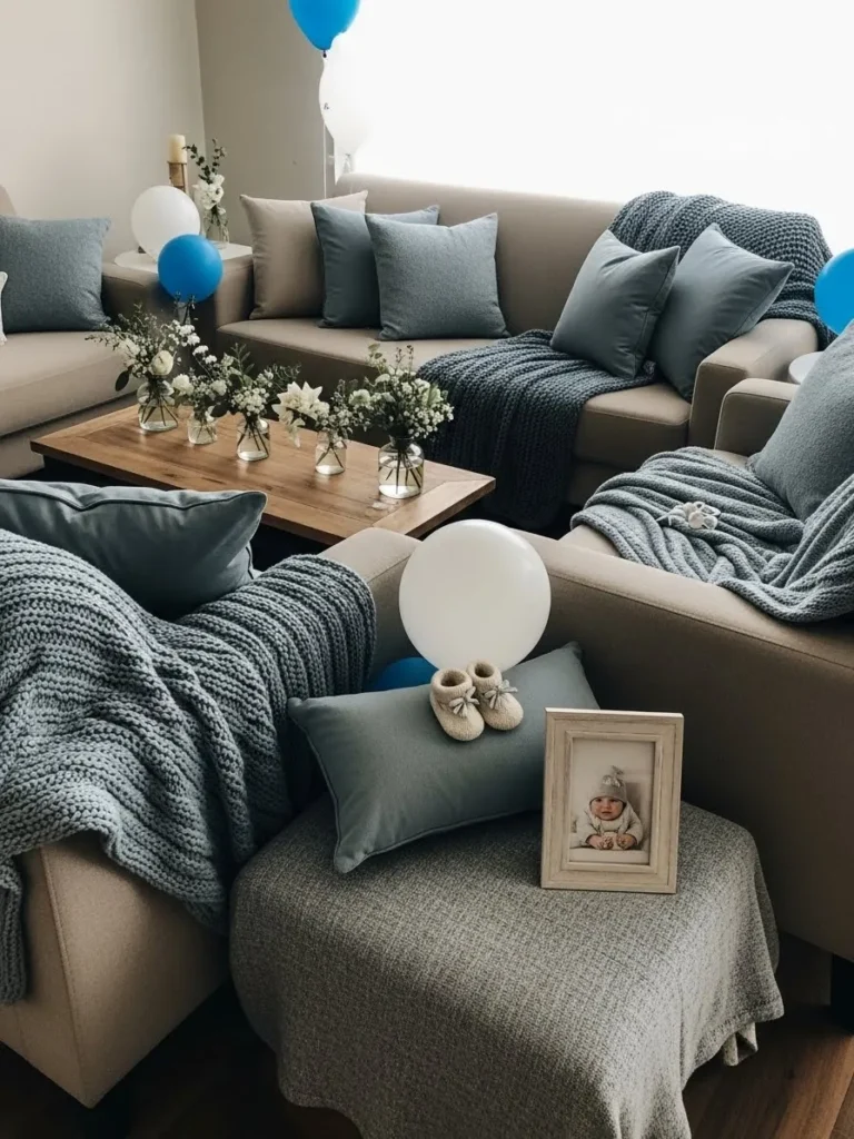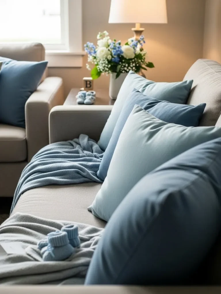 This design leans into soft baby blue tones layered on a warm neutral sofa that instantly feels calm and welcoming. Plush cushions in slightly different shades of blue add depth without feeling busy, while the cozy knit throw casually draped across the seat gives it that lived in softness everyone loves. A simple side table with a glowing lamp and a small floral arrangement in white and blue keeps the space feeling fresh and gentle. The tiny baby socks placed thoughtfully on the sofa quietly hint at the celebration ahead without overpowering the room.