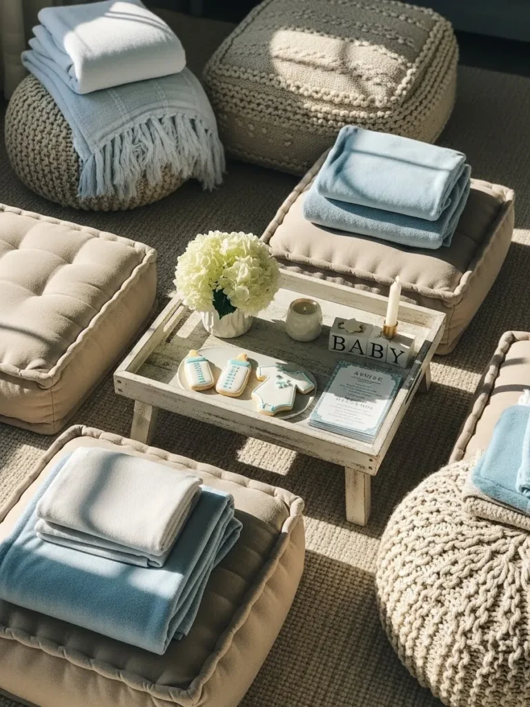 This setup is all about low level comfort and gentle color. Plush floor cushions and chunky knit poufs are layered in soft beige tones, creating a relaxed lounge style layout that feels inviting and calm. Light blue throws are neatly folded on top of the seating, adding just enough color without overpowering the space. The small rustic table in the center keeps everything grounded and practical, styled with sweet baby themed cookies, simple florals, and subtle decor pieces that feel thoughtful but not overdone. Natural textures like woven knits and linen fabrics make the whole arrangement feel warm and lived in.