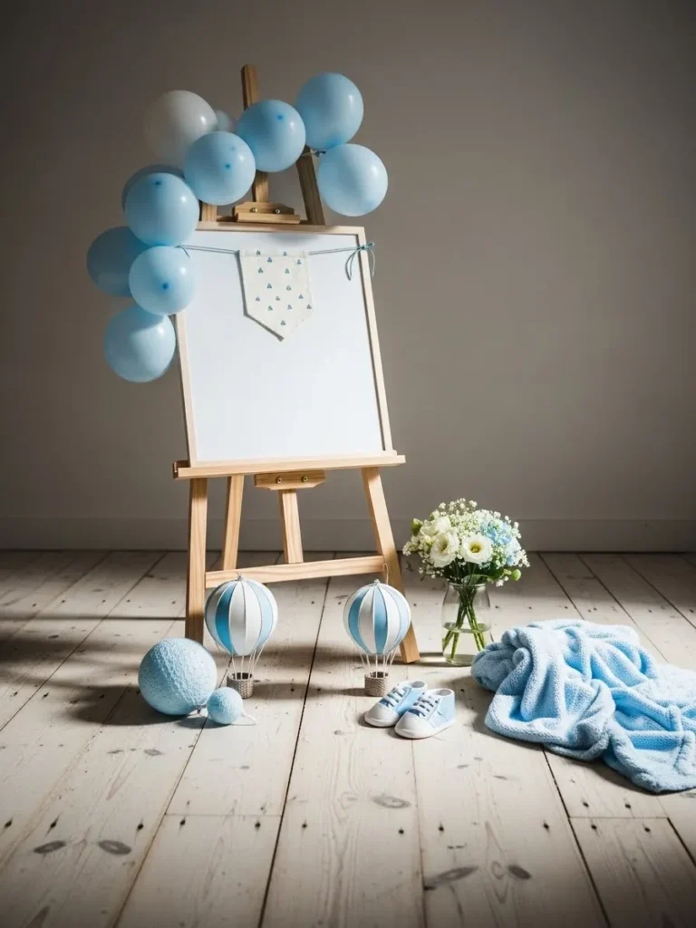 This setup feels like a calm little moment carved out just for celebrating a baby boy. The soft blue balloons draped casually over the wooden easel bring a gentle pop of color without feeling loud. The white display board keeps things clean and airy while the tiny details around it really do the heavy lifting. Light wood floors add warmth and balance while the baby blue blanket and miniature shoes make the whole scene feel cozy and lived in. The hot air balloon decor and simple floral arrangement tie everything together in a way that feels thoughtful but not overstyled.