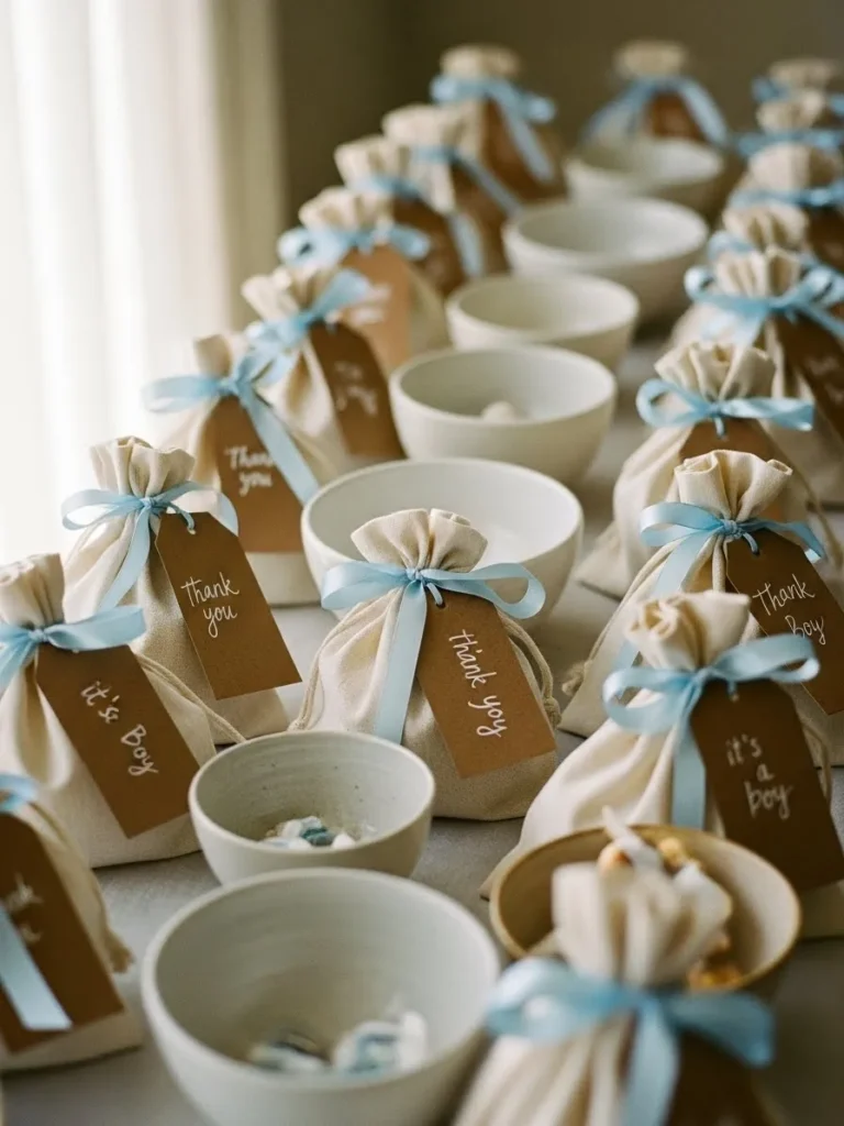 This setup feels calm and thoughtful with its soft neutral palette and simple textures doing all the heavy lifting. Linen favor bags tied with pale blue ribbons are neatly arranged alongside small ceramic bowls, creating a look that feels curated but not fussy. The kraft paper tags add a sweet handmade touch while keeping everything grounded and warm. It has that airy natural light vibe that makes the whole table feel cozy, intentional, and quietly elegant without trying too hard.