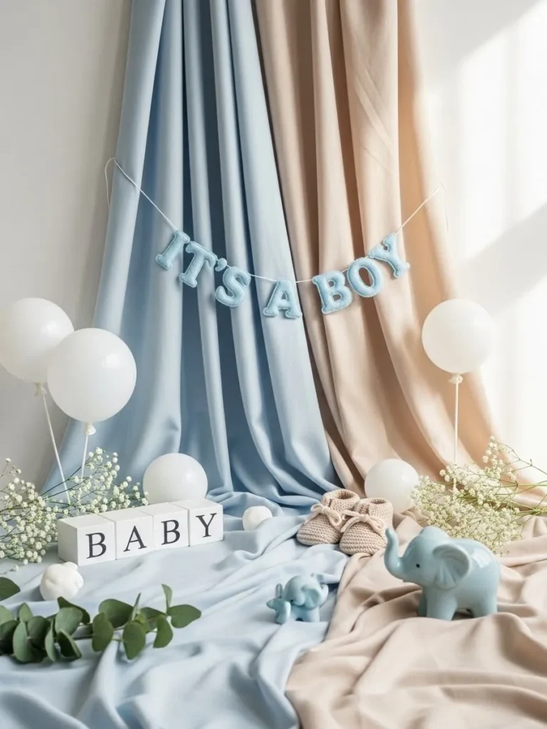 This setup feels like a dreamy little corner pulled straight from a calm nursery mood board. Flowing fabric panels in dusty blue and warm sand tones create a soft layered backdrop that instantly feels cozy and welcoming. The delicate baby blue banner adds a sweet personal touch without overpowering the space, while the mix of white balloons and airy florals keeps everything light and balanced. I love how the styling stays simple with natural textures like knitted booties, soft linens, and subtle greenery that ground the look and make it feel warm instead of staged.