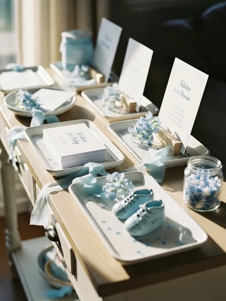This setup feels like such a thoughtful little moment within the baby shower space. A slim wooden table is styled with soft blue trays holding tiny keepsakes, delicate ribbons, and sweet paper cards for guests to leave advice for the parents to be. The pale blue tones feel calm and gentle, while the natural wood adds warmth so it never feels overly themed. I love how everything is neatly arranged but still relaxed, like it was styled with care but not fussed over too much. The small glass jars and simple paper details give it that cozy at home feeling that works beautifully for an intimate gathering.