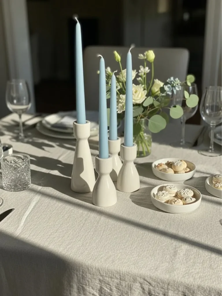 Soft Blue Table Styling With Modern Candle Accents