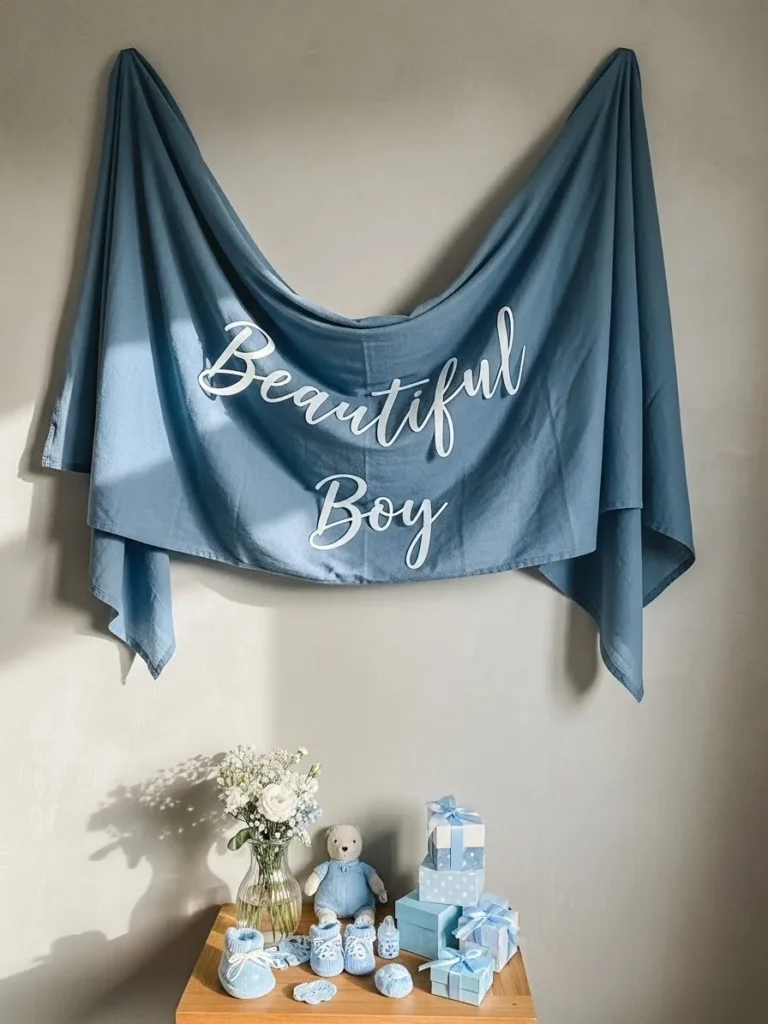 This setup leans into a calm and cozy look with a soft blue fabric backdrop draped gently across a neutral wall. The fabric creates an effortless focal point and sets a soothing tone that feels perfect for welcoming a baby boy. Below it, a simple wooden table holds a sweet little arrangement of baby essentials like tiny booties, neatly wrapped gifts, and a plush teddy in matching blue shades. The muted palette keeps everything feeling airy and uncluttered while still looking thoughtfully styled and photo ready.