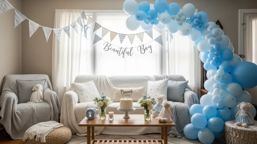 This living room setup feels calm and welcoming with its soft beige sofas layered in dusty blue pillows and chunky knit throws. The color palette stays gentle and soothing which works perfectly for a baby shower celebrating a little boy. Simple glass vases with fresh white florals line the wooden coffee table adding a touch of sweetness without feeling overdone. Blue and white balloons are placed casually around the space which keeps the look festive but still very homey. Natural light fills the room and highlights all the cozy textures making the entire setup feel warm and inviting.