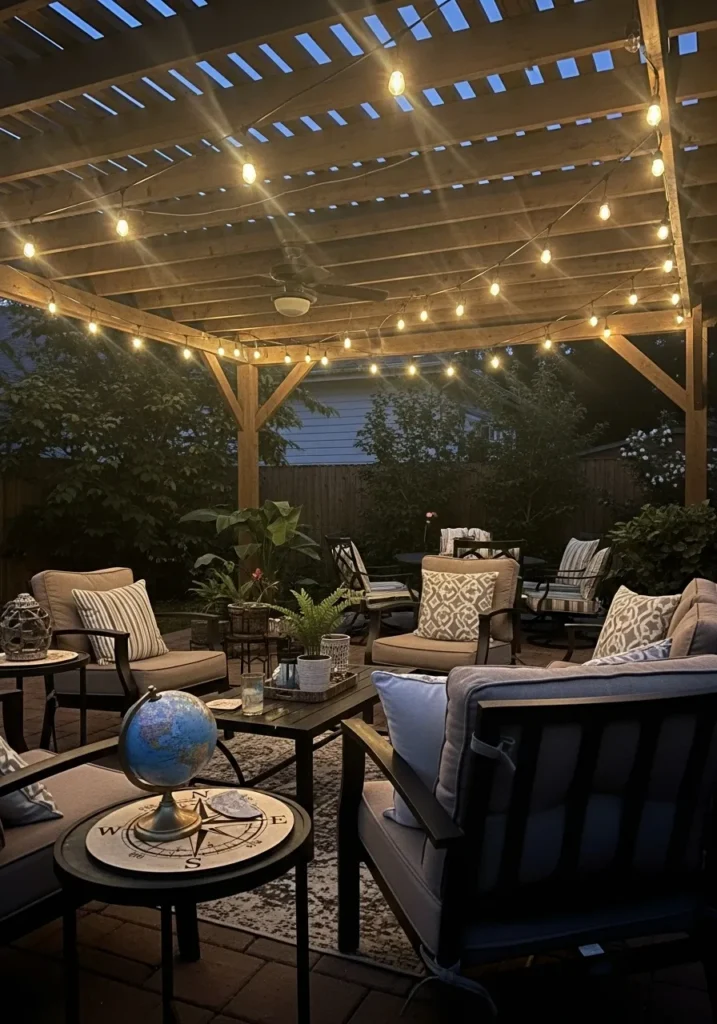 This pergola lounge glows with warm lights and comfortable seating tucked neatly underneath. The layout feels intimate and cozy, perfect for smaller group conversations. Soft lighting and layered cushions make it feel like an outdoor living room.