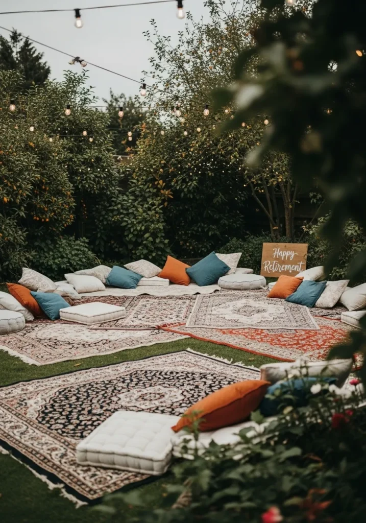 This low table picnic layout uses cushions, layered rugs, and casual seating spread across the lawn. The colors feel soft and welcoming, and everything is placed close enough to encourage easy conversation.