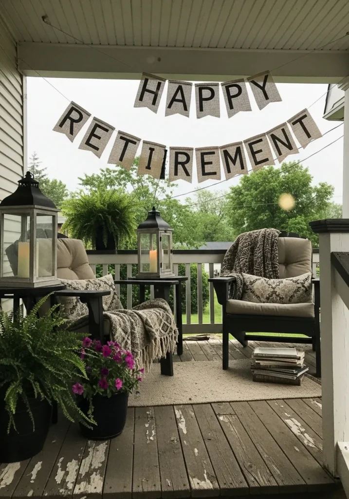 This porch space is styled with comfortable seating, greenery, and a simple happy retirement banner overhead. The wood floors and soft cushions create a warm and familiar setting that feels like home.