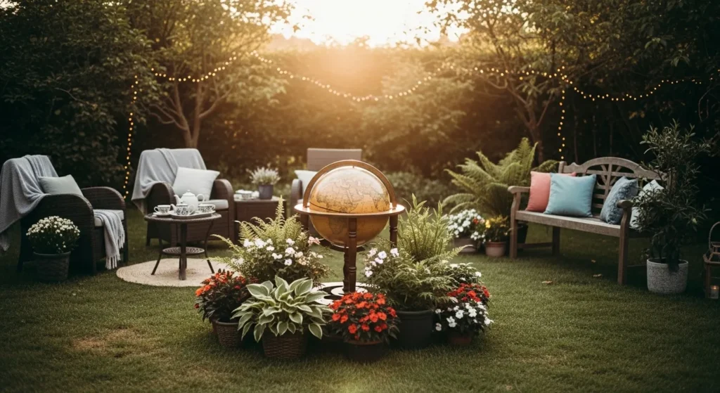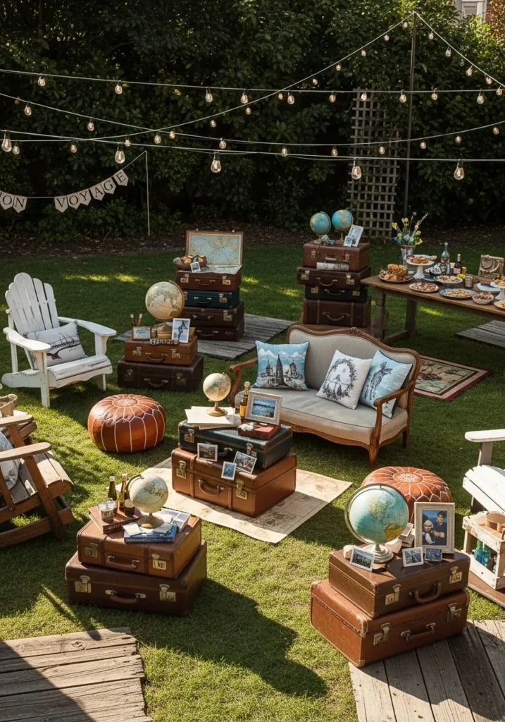 This backyard scene is filled with vintage suitcases, cozy seating, and string lights glowing overhead. The travel inspired decor feels playful while still grounded, and the layout feels perfect for an evening gathering.