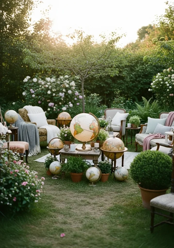 This garden party setup is filled with tables, globes, florals, and cozy seating spread across the lawn. The mix of greenery and soft decor makes it feel like a peaceful celebration surrounded by nature.