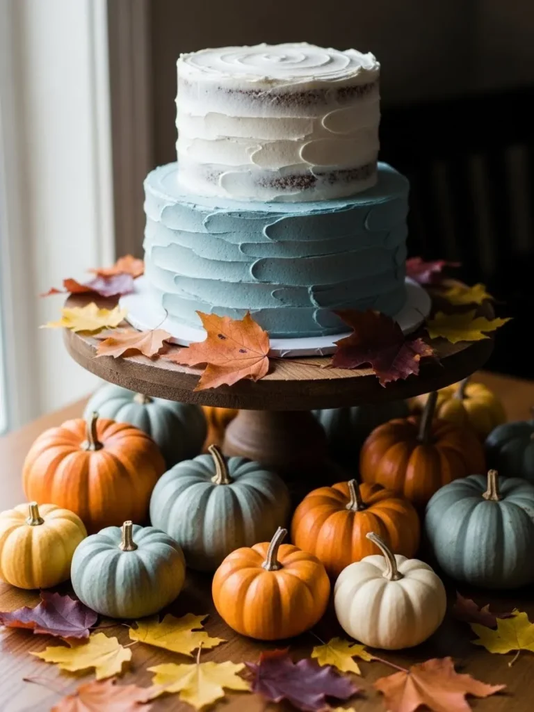 This setup features a beautifully styled tiered cake display with soft blue and creamy white frosting that feels calm and cozy at the same time. The cake sits on a simple wooden stand and is surrounded by mini pumpkins in muted fall tones like sage green, warm orange, and creamy ivory. Scattered autumn leaves add that seasonal touch without making things feel overly themed or busy. The overall look is clean, balanced, and perfect for a fall baby shower that leans charming rather than cheesy.