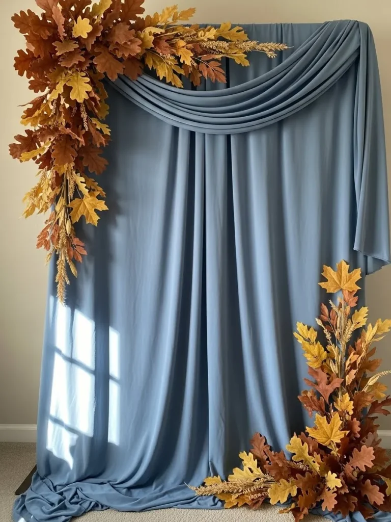 This setup features a flowing soft blue fabric backdrop with gentle draping at the top that instantly feels calm and welcoming. The fabric pools naturally at the floor, giving it that relaxed lived in look that works so well for fall gatherings. Warm autumn leaves in shades of caramel amber and golden brown frame the backdrop on both sides, adding seasonal texture without overpowering the space. The mix of cool blue tones with cozy fall foliage feels perfectly balanced and photo ready, especially for a boy baby shower that wants to lean stylish but still sweet.