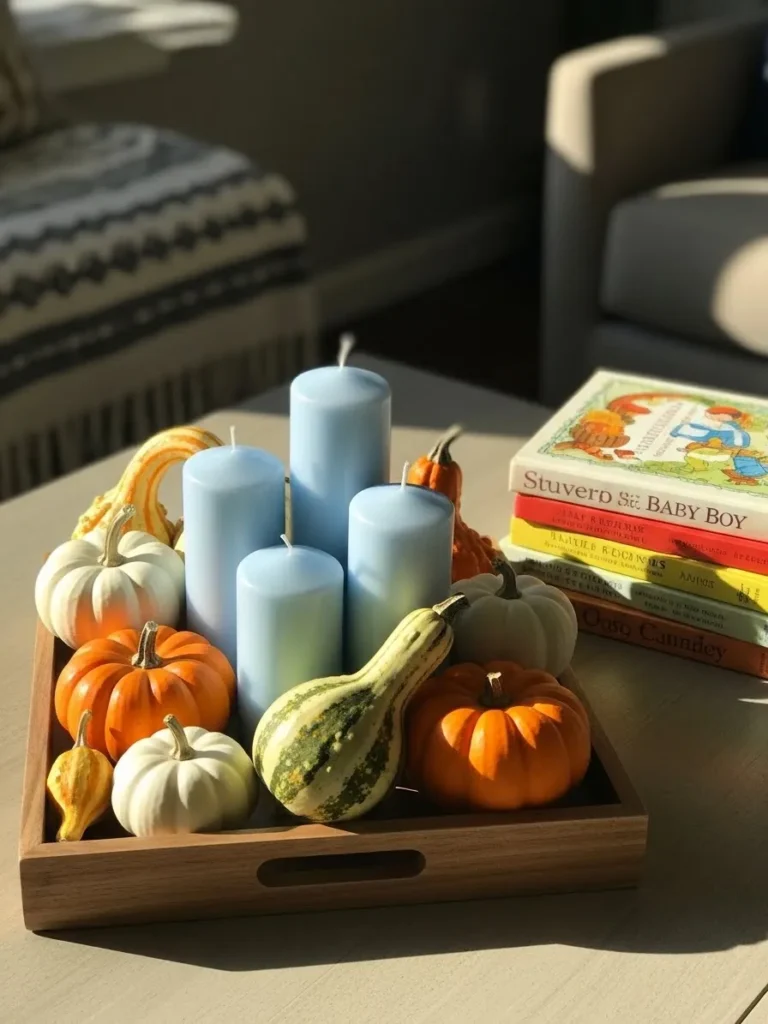 This cozy coffee table setup feels perfectly made for a fall baby shower with a sweet boy theme. A wooden tray anchors the look and holds soft blue pillar candles surrounded by mini pumpkins and gourds in creamy white, warm orange, and gentle green tones. The mix of textures feels relaxed and natural, and the soft blue candles add that baby boy touch without feeling overly themed. Sunlight spilling across the table makes everything feel warm and inviting, like a calm afternoon at home with autumn just outside the window.