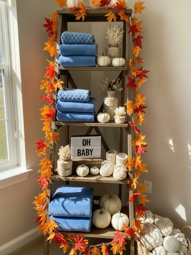This charming shelf setup feels like the perfect blend of autumn warmth and baby shower sweetness. A rustic wooden shelving unit is dressed up with a cascade of faux fall leaves that instantly bring in those cozy seasonal vibes. Soft blue blankets and towels are neatly stacked to add a calm boy friendly color pop that balances all the warm oranges and creams. Little white pumpkins, textured vases, and dried florals give it that Pinterest worthy layered look. The tiny knit baby booties and the sweet Oh Baby sign make it clear this space is celebrating something very special without feeling overdone.