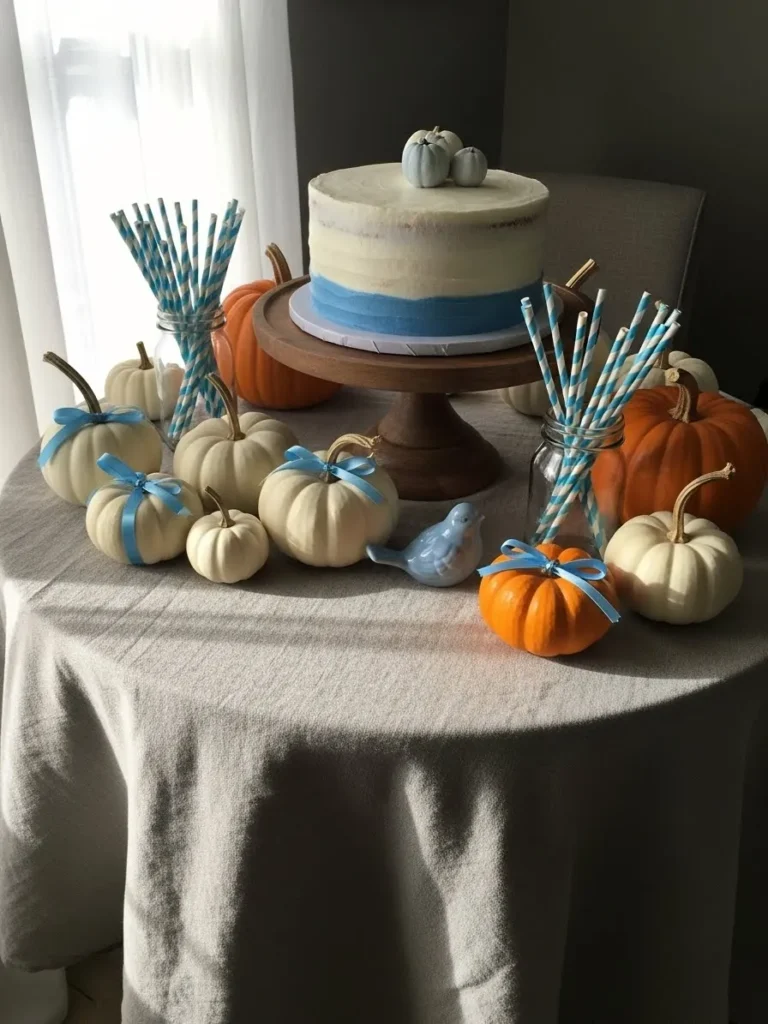 This setup blends soft fall charm with a sweet pop of blue in the most unexpected way. The star of the table is a simple frosted cake with gentle blue ombre layers sitting on a warm wooden stand, surrounded by creamy white and classic orange pumpkins tied with delicate blue ribbons. Glass jars filled with blue striped paper straws add a playful touch, while the neutral tablecloth keeps everything feeling calm and cozy. Natural light, soft textures, and those tiny decorative pumpkins make the whole table feel seasonal without going full autumn overload.
