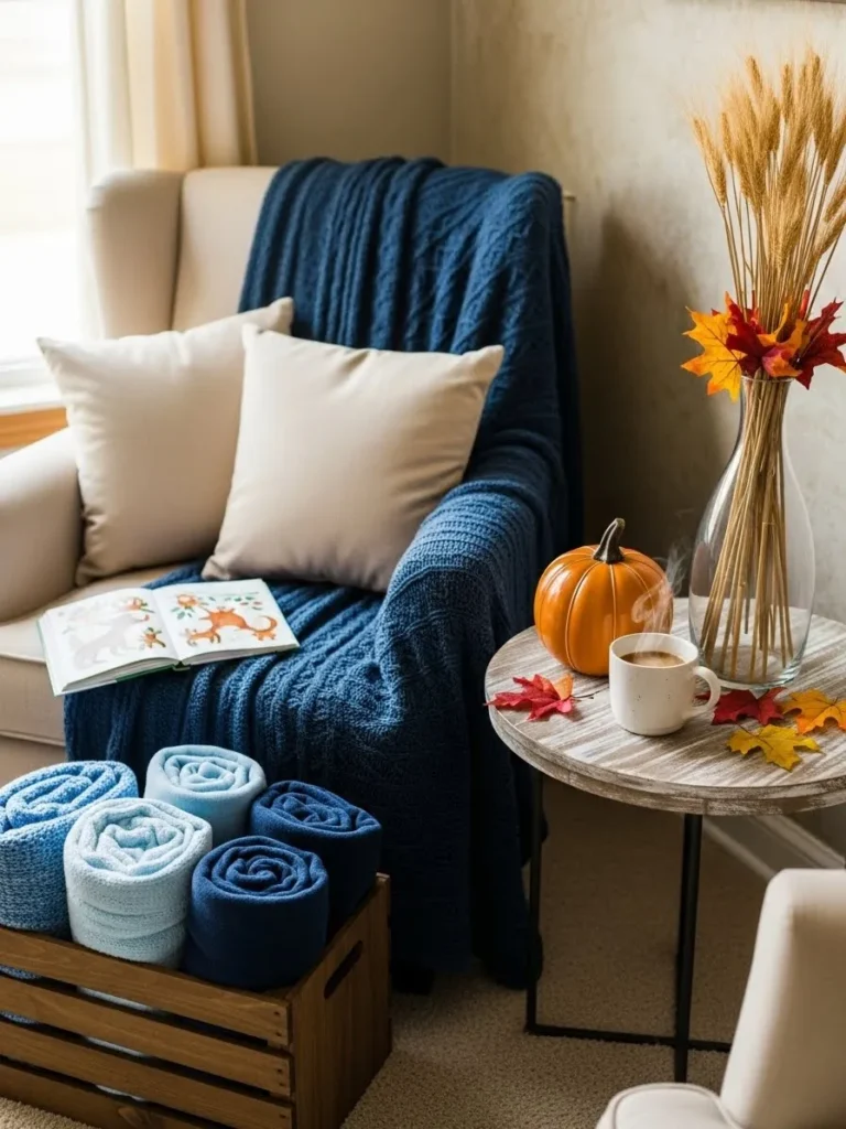 This setup feels like the coziest corner you could curl up in on a crisp fall afternoon. The soft armchair layered with deep blue knit throws instantly brings calm cozy vibes while the neutral pillows keep everything light and baby friendly. I love how the small wooden side table adds warmth with a simple pumpkin mug and fall leaves while the tall vase of wheat brings in that seasonal texture without feeling overdone. The rolled blankets tucked neatly in the crate are such a smart touch and they double as both decor and practical comfort for guests.