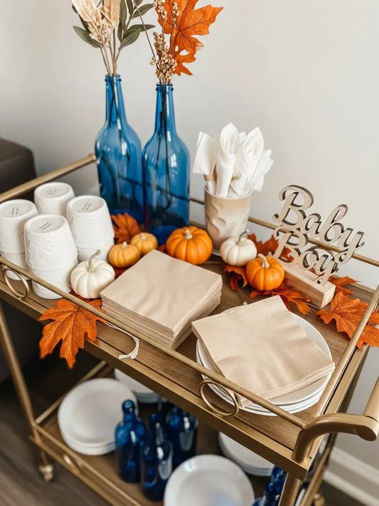 This setup is all about a warm and welcoming fall moment that feels festive without trying too hard. A simple bar cart is styled with soft blue glass bottles, neutral napkins, and crisp white dishware, then layered with tiny pumpkins and autumn leaves for that cozy seasonal touch. The mix of natural wood, brass details, and muted fall colors keeps everything feeling calm and polished, while the Baby Boy sign adds just the right amount of sweetness without overwhelming the space. It’s practical too, with plates, cups, and napkins all neatly arranged and easy for guests to grab.
