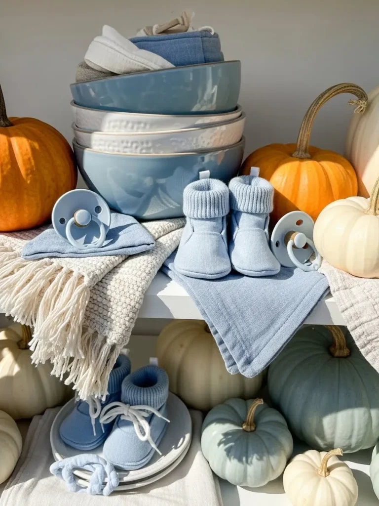 This sweet little shelf setup mixes soft blue baby essentials with cozy fall accents in the prettiest way. Stacked ceramic bowls in muted blue tones create a calm and polished base, while folded knit blankets and tiny booties add that heart melting baby touch. The pumpkins in creamy white and warm orange bring in just enough autumn charm without overpowering the gentle color palette. Everything feels thoughtfully placed but still relaxed, like a styled shelf that just happens to be baby shower ready.