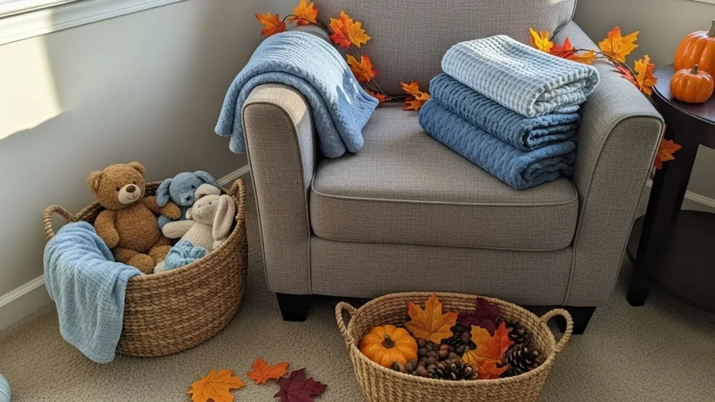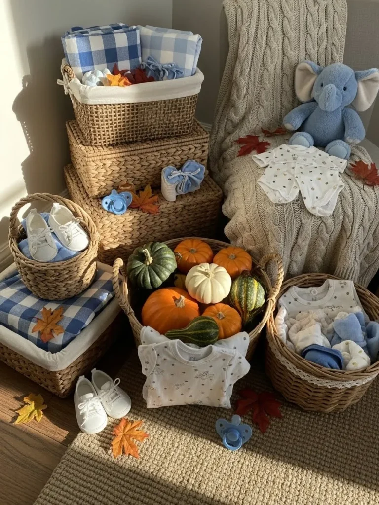 This setup feels like a sweet little fall nook made just for celebrating a baby boy. Woven baskets filled with soft blue blankets, tiny outfits, and baby shoes create a layered, cozy look that instantly feels warm and welcoming. The muted blue tones pair beautifully with the creamy knits and natural textures, while the small pumpkins and scattered fall leaves add just the right seasonal touch. I love how everything feels thoughtfully placed but not overly styled, like a calm corner you could imagine setting up in a living room or nursery without any stress.