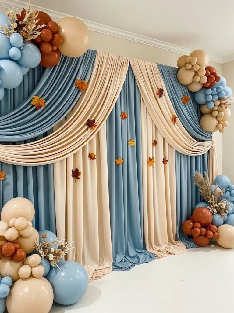 This setup features layered fabric panels in dusty blue and warm cream, draped loosely to create a cozy, gathered look that feels both elegant and welcoming. The backdrop is framed with organic balloon clusters in soft blue, caramel brown, and muted beige, accented with dried florals and pampas for that unmistakable fall touch. Scattered autumn leaves add a playful seasonal nod without feeling themed or overdone, while the flowing fabric softens the whole space and makes it feel warm and inviting rather than staged.