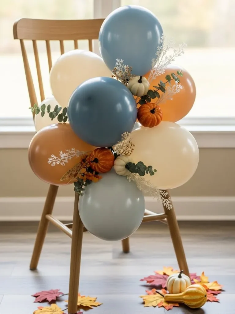 This sweet setup features a soft balloon cluster styled right onto a wooden chair, mixing muted blues, warm creams, and gentle caramel tones that feel perfectly fall ready. Tiny pumpkins and faux autumn stems are tucked between the balloons, giving the whole arrangement a seasonal twist without feeling overdone. The natural wood chair and simple background keep it grounded and homey, while the rounded balloons add that playful baby shower charm that instantly makes the space feel special.