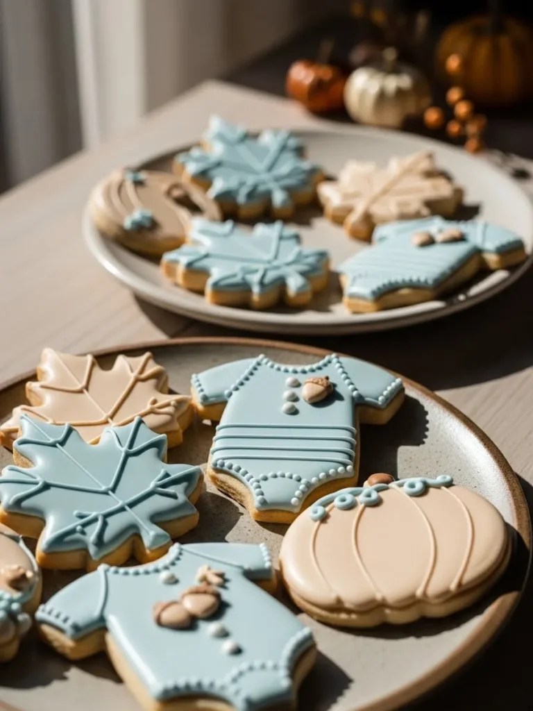 This setup features the prettiest fall themed sugar cookies styled in soft blue and warm beige tones that feel cozy without leaning too seasonal. You can see baby onesies, maple leaves, and little pumpkins all iced with smooth matte finishes and delicate piping details. The color palette feels calm and intentional, mixing dusty blue with creamy neutrals that work beautifully for a boy baby shower in autumn. Displayed on simple ceramic plates with natural light and subtle fall accents in the background, the whole look feels warm, inviting, and very Pinterest ready.
