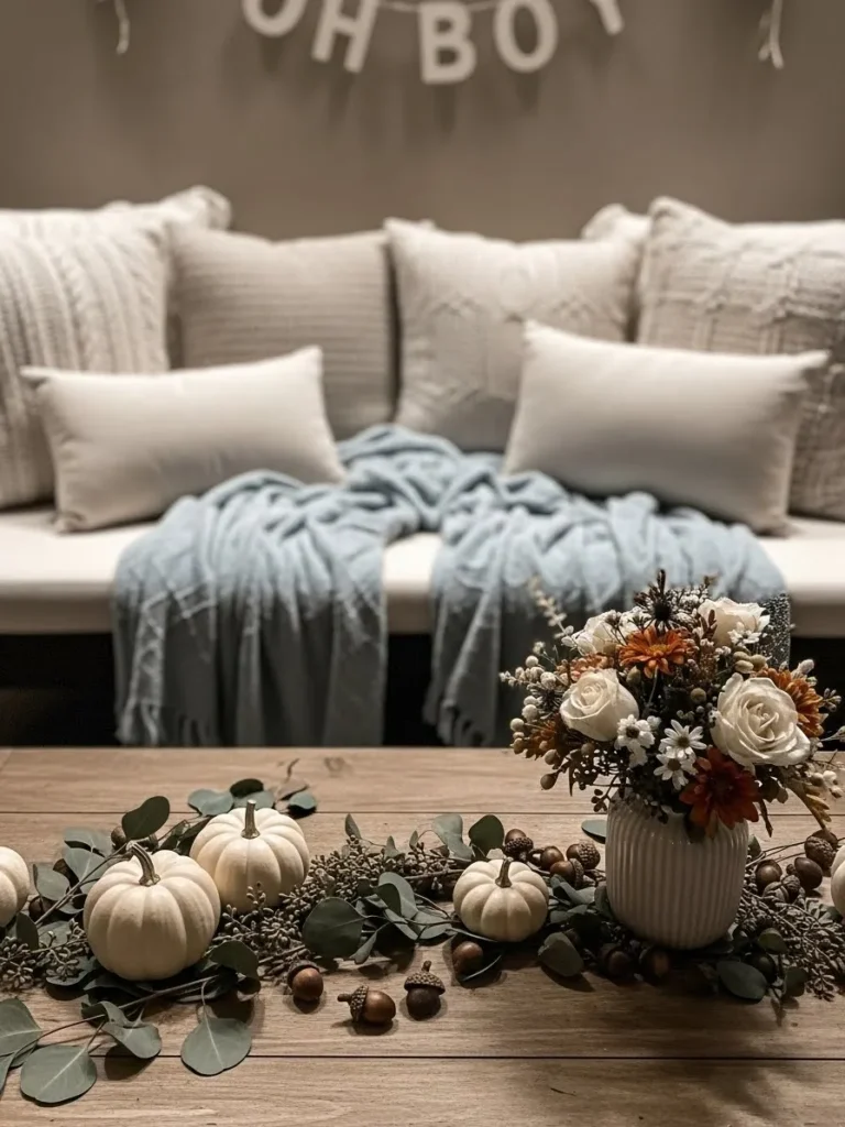 This design feels like a soft cozy hug the moment you look at it. A neutral sofa layered with plush textured pillows sets a calm and welcoming tone while a light blue throw adds just enough gentle color without stealing the spotlight. The wooden coffee table becomes the star with a fall inspired centerpiece made of mini white pumpkins eucalyptus greenery and warm acorns. Everything feels balanced and intentional with soft beige tones warm wood finishes and subtle seasonal touches that work perfectly for a boy baby shower in fall.