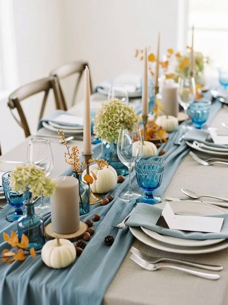 Soft Blue Fall Table Setting With Cozy Seasonal Touches