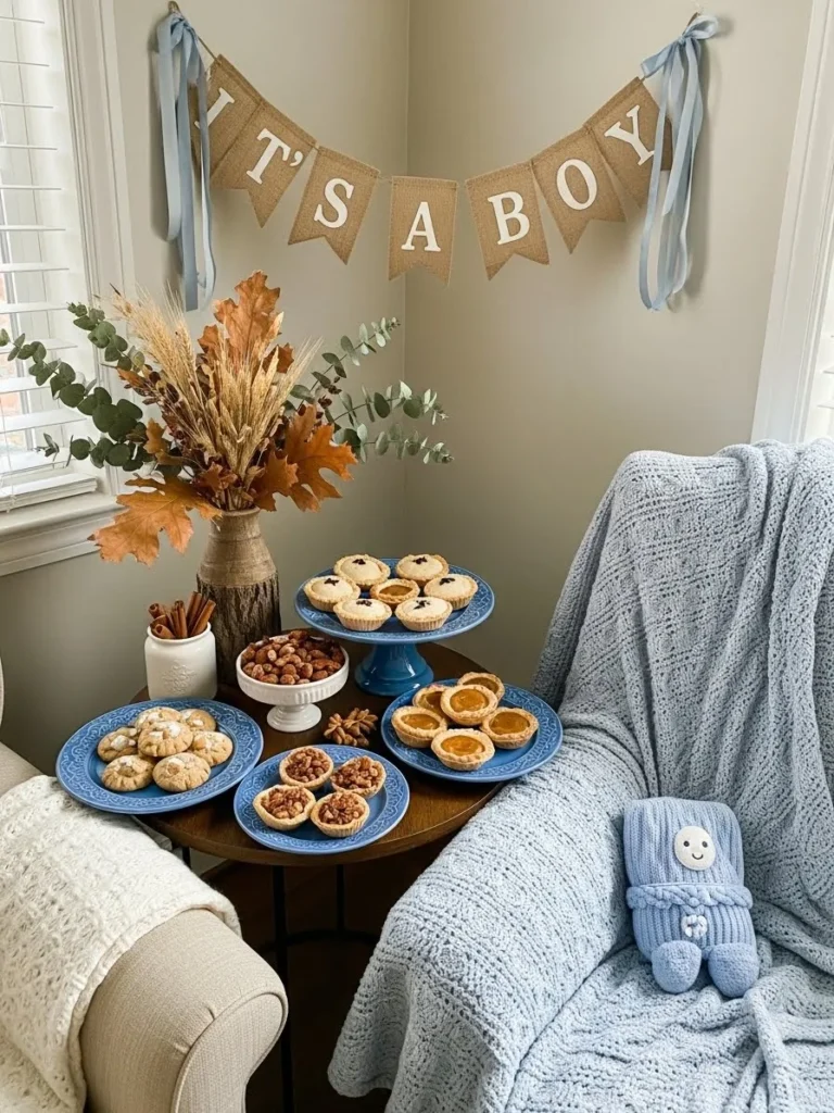 This setup feels like the sweetest little corner made just for a fall baby shower. A soft blue knit throw draped over a comfy chair instantly sets a cozy tone while tying into a classic boy color palette. The small round table is styled with blue cake stands and plates filled with bite sized treats that feel homemade and inviting. Neutral walls keep everything calm and airy while the burlap banner adds a gentle rustic touch that works beautifully for fall. Dried leaves wheat stems and eucalyptus bring in seasonal texture without overpowering the space which makes the whole nook feel warm and thoughtfully styled.