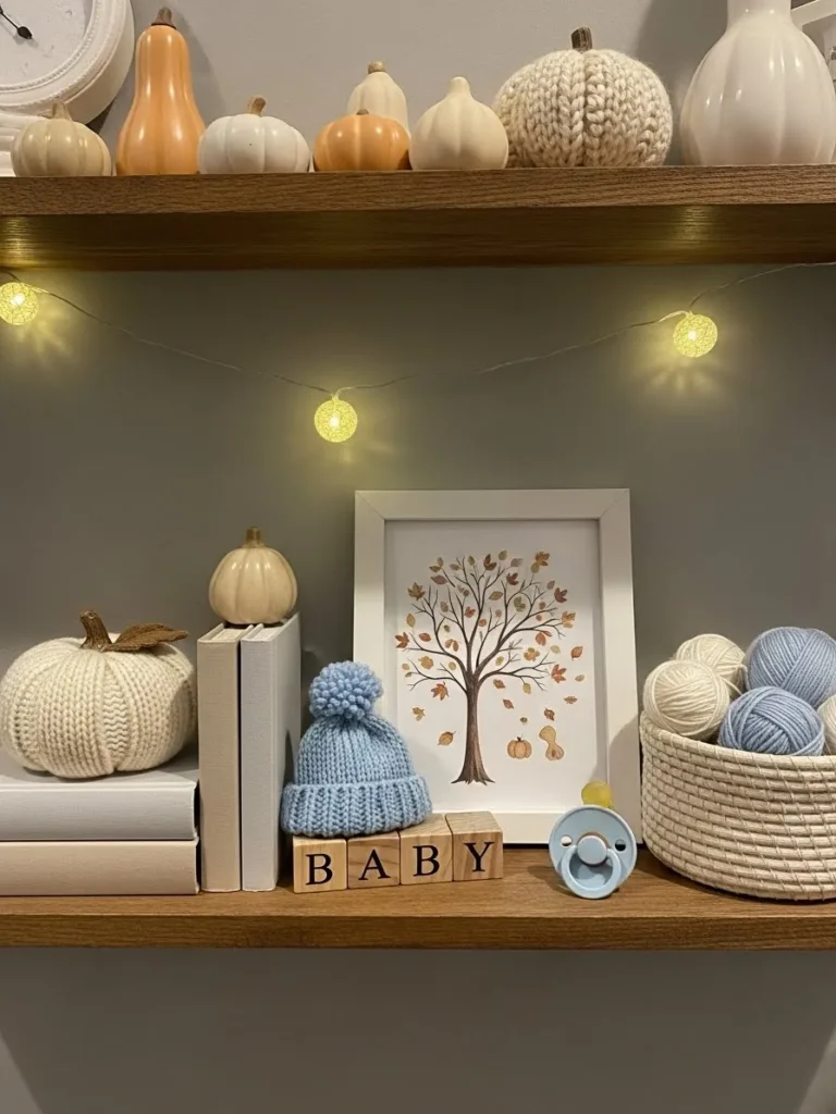 This shelf setup feels like fall wrapped up in the sweetest baby shower moment. Soft neutral pumpkins line the top shelf in creamy whites and warm peach tones, mixed with cozy knit textures that instantly add warmth. The lower shelf layers simple white books with a framed autumn tree print, a tiny blue knit baby hat, wooden letter blocks spelling baby, and a basket filled with yarn in soft blue shades. Warm fairy lights glow gently across the shelves, tying everything together and making the whole display feel calm, thoughtful, and perfectly seasonal without going over the top.
