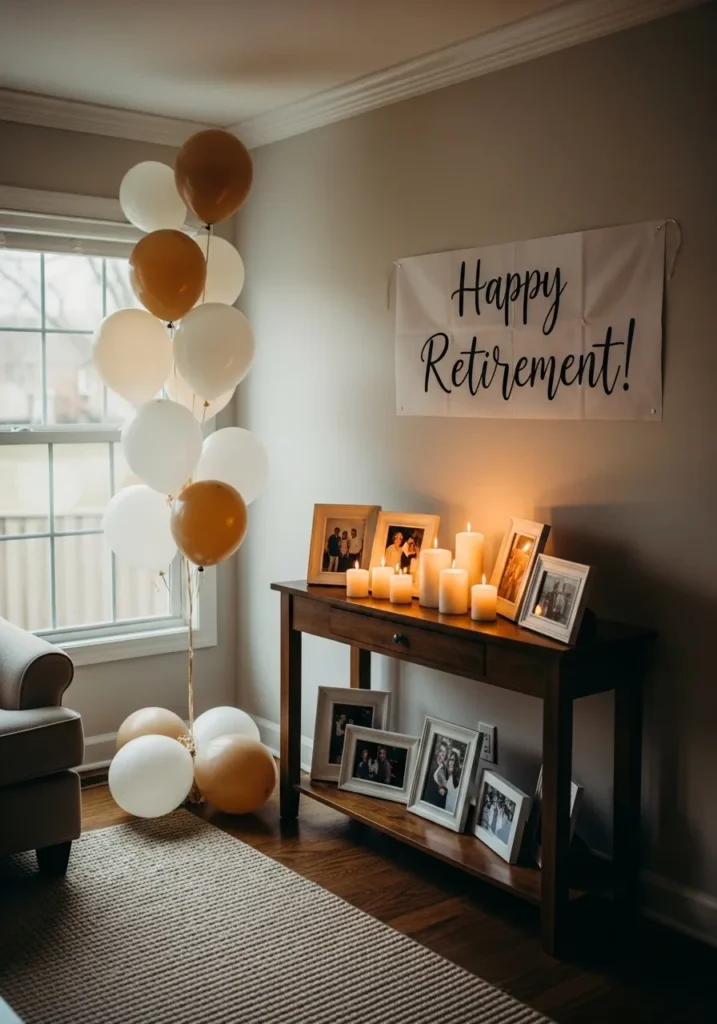 This setup features a slim console table styled with framed photos, glowing candles, and a simple retirement banner hung casually on the wall. Neutral balloons in soft cream and warm brown tones add height and balance, while the sheer curtains let in gentle daylight that softens the whole scene. Everything feels calm, personal, and intentionally understated.